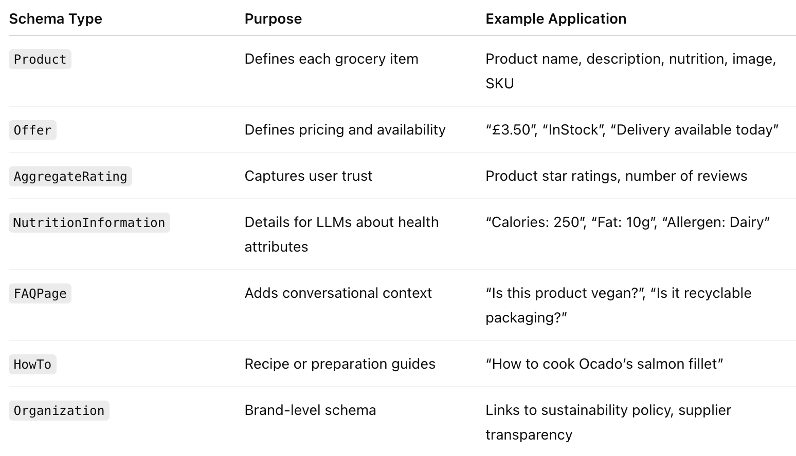 AI PromptTarget SchemaExample Answer Source“Best gluten-free pasta”Product + FAQOcado’s Barilla Gluten-Free Pasta page“Healthy snacks for kids”CategoryOcado Kids’ Snack Hub“Best online grocery for same-day delivery”OrganizationOcado’s delivery information schema