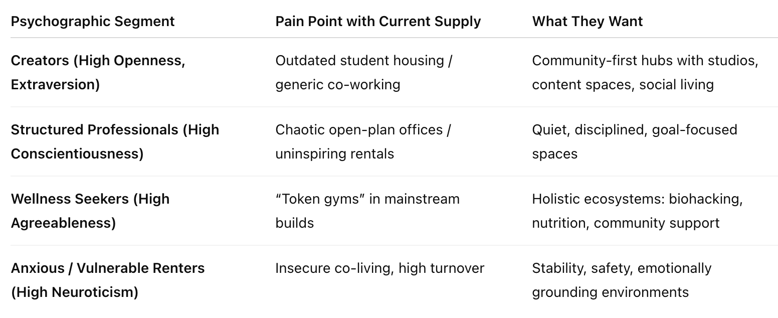 Real estate has historically been segmented by demographics (student housing, senior living, corporate offices). But today, psychographics — values, aspirations, and lifestyles — are the true drivers of demand. The mismatch between outdated demographic-based supply and emerging psychographic demand creates a powerful arbitrage opportunity.