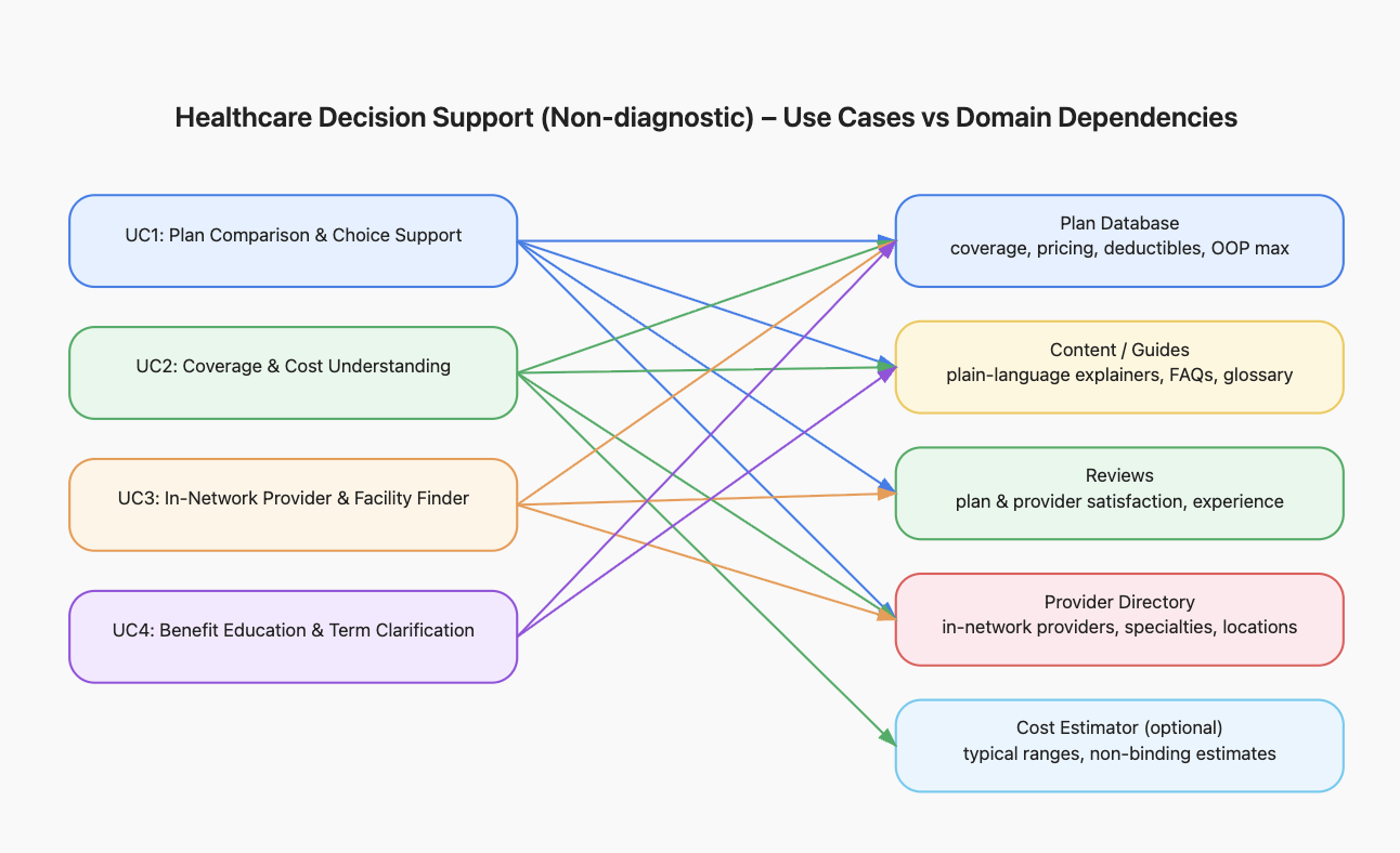 This is where multi-domain orchestration becomes essential. By merging structured insurance data with explanatory content and patient feedback, an intelligent system can guide users toward more informed, confident decisions—without providing diagnostics or medical advice.