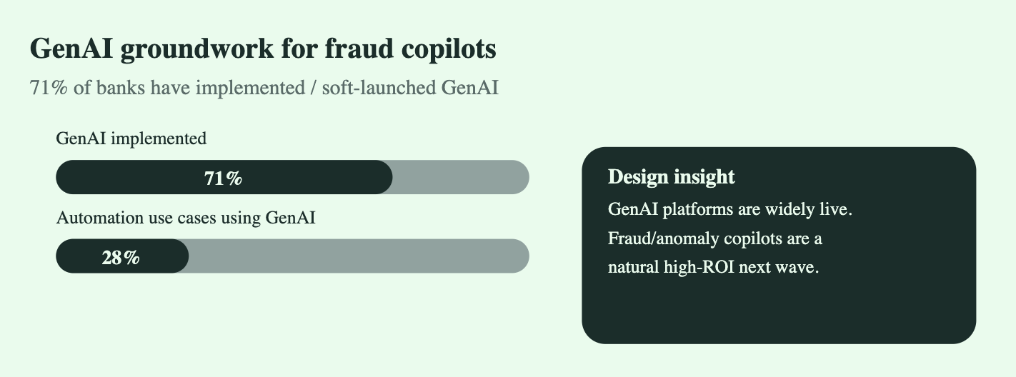 71% of banks have already implemented or soft-launched GenAI solutions, with fraud and risk among the top three workloads.