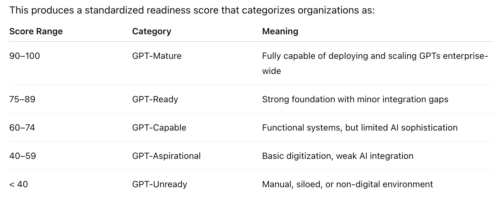 The result is a measurable, repeatable, and scalable way to evaluate GPT maturity, applicable to any industry and adaptable to any stage of digital evolution.