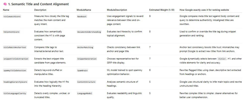 The titleMatchAnchorText ensures our title tags and header(s) are compared to internal and external anchors and evaluated in comparison to the hierarchy of the page (the headingHierarchyScore).
