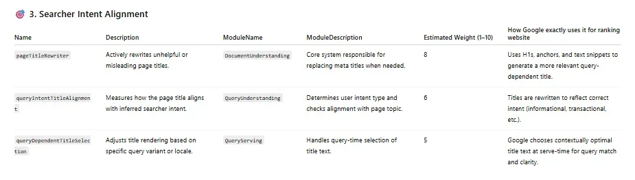 And page titles are rewritten at a query level. The queryIntentTitleAlignment measures how the page title aligns with searcher intent. Once this is established, the page alignment and query intent is reviewed to ensure the title best reflects the page at a query level.