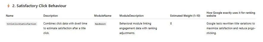 The titleClickSatisfaction metric combines click data at a query level with on-page engagement data (think scroll depth, time on page, on-page interactions, pogo-sticking).