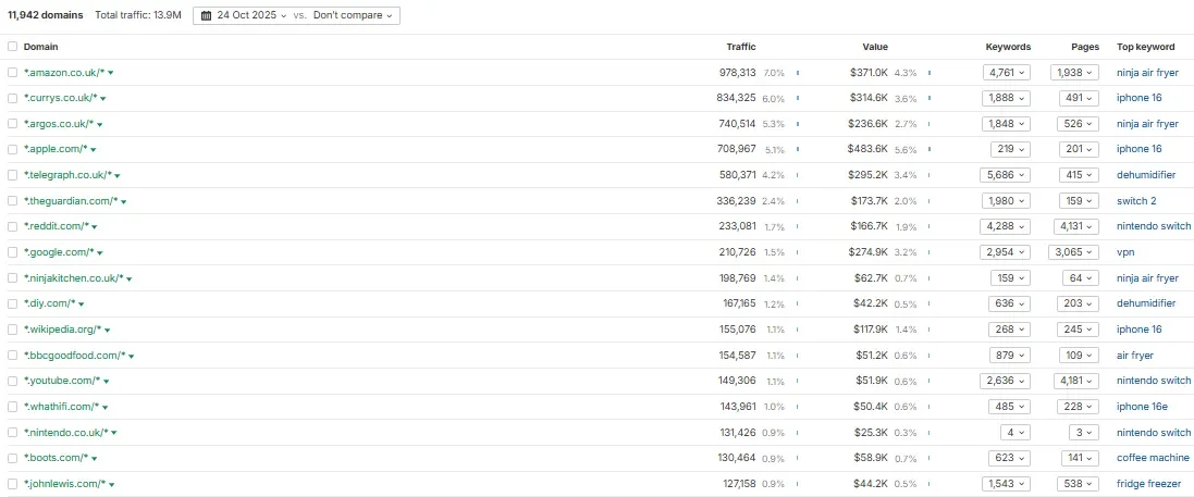 Also worth breaking this down in total and by article. or you can use something like Ahrefs’ Traffic Share report to determine your share of voice via third party data.