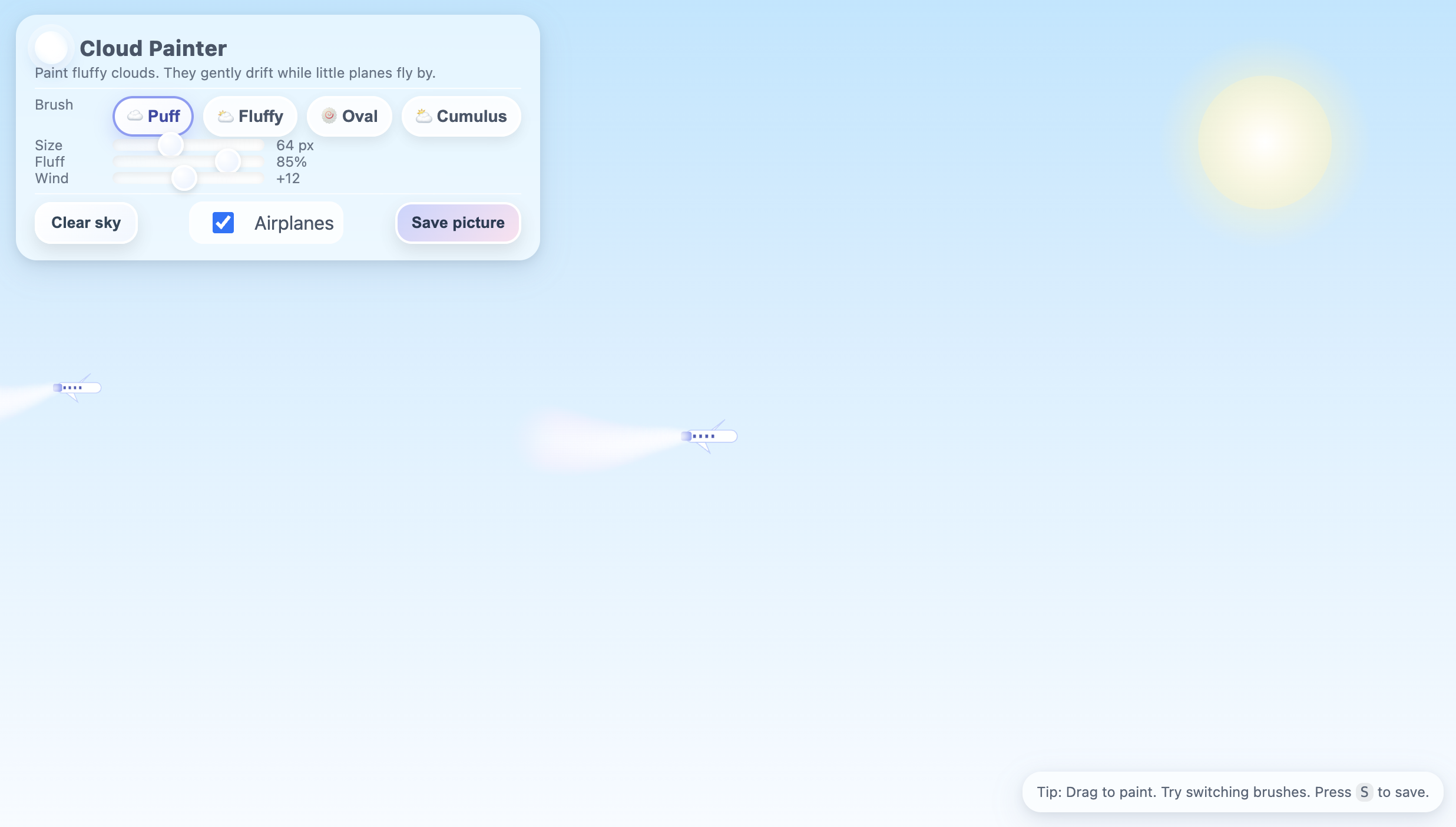 PROMPT - Create a single-page app in a single HTML file with the following requirements: - Name: Cloud Painter - Goal: Paint the sky by drawing clouds with a brush tool; enjoyable for kids. - Features: Multiple brush shapes, animated cloud drift, air planes to fly in the sky, save image. - The UI should be soft and whimsical.