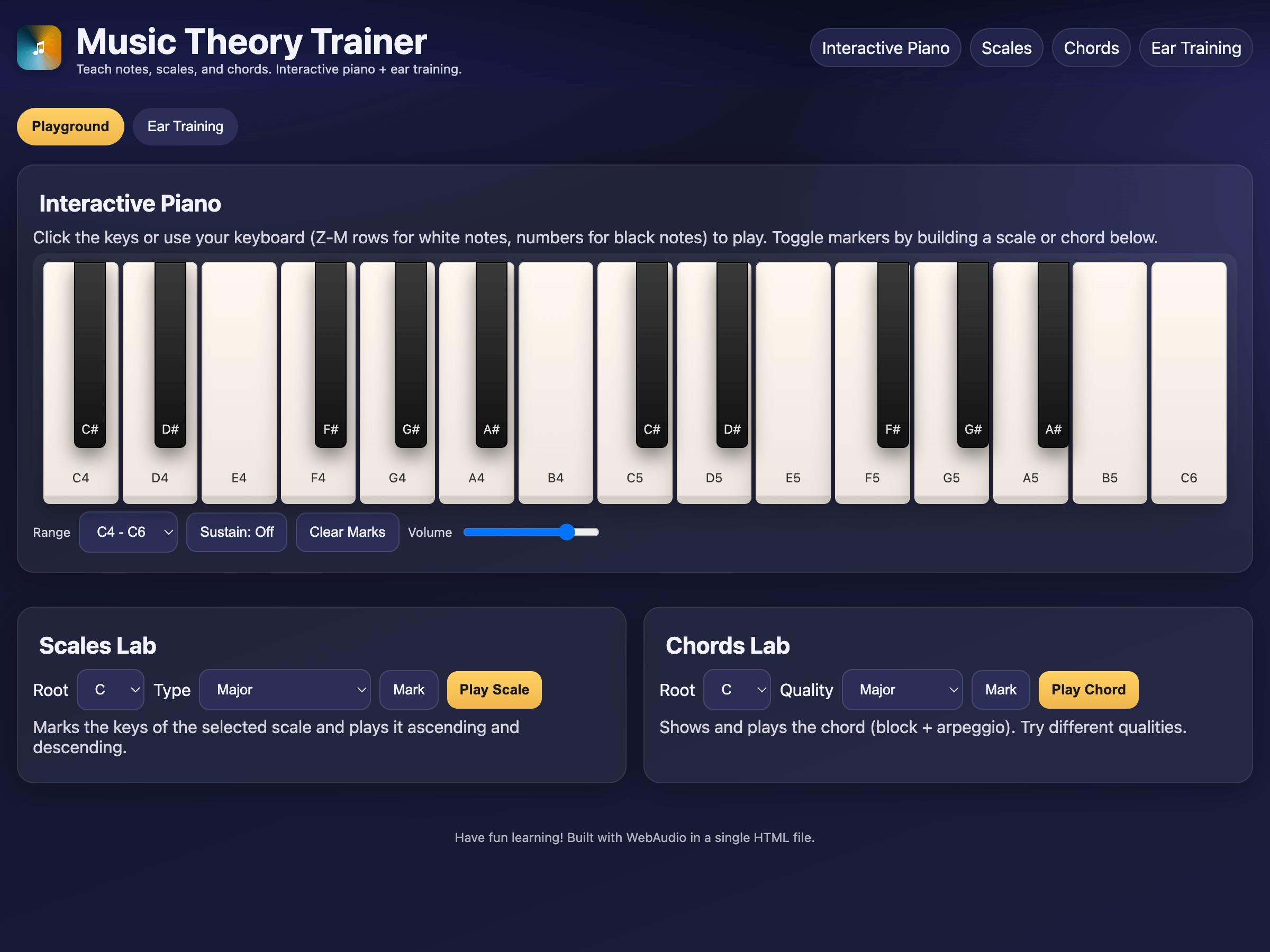 Create a single-page app in a single HTML file with the following requirements: - Name: Music Theory Trainer - Goal: Teach notes, scales, and chords. - Features: Interactive piano, ear training exercises. - The UI should be music-themed, interactive, and fun.