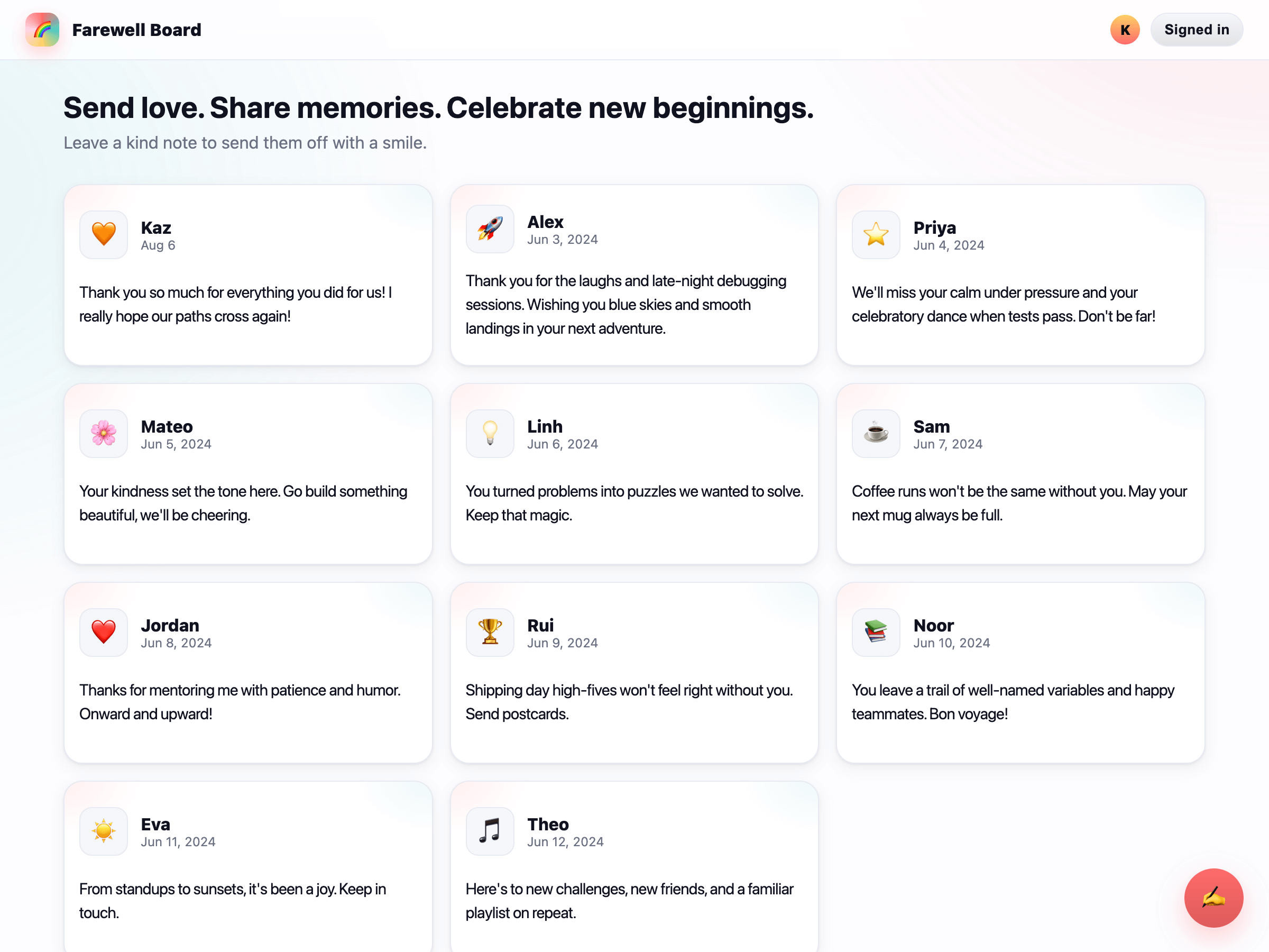 Create a single-page app, in a single HTML file, for a farewell message board with a warm and fun feeling: - Use the latest UI components to give the site a professional appearance. - Display 10 pre-posted messages nicely as heartfelt cards, each with a meaningful picture. If a message includes pictures, be sure the text remains the main focus. - Include a "Write" button that allows users to add new messages. - Add a pseudo login button at the top. - Ensure UI design policies, such as button sizes, are consistent throughout.