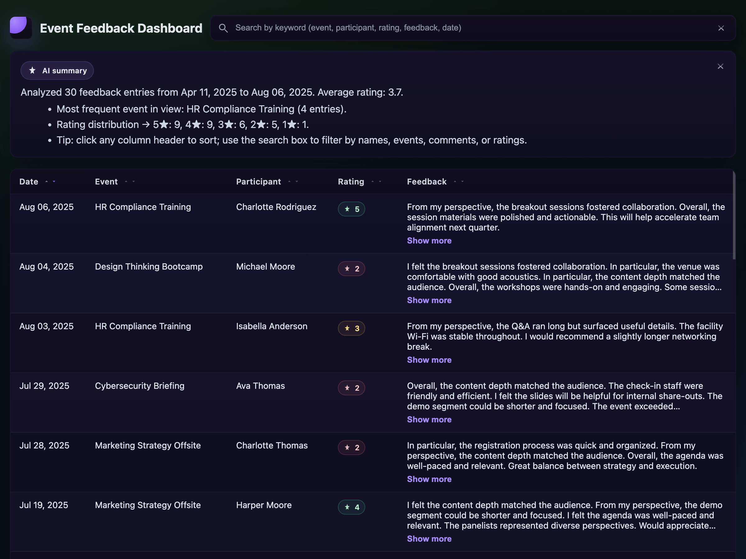 Create a single-page app in a single HTML file that provides the following features using modern, user-friendly web frontend components suitable for business users: - Display a large table view listing all database rows. The data includes event participant feedback submissions with columns for date, event name, participant name, rating, and feedback. - Feedback should be a bit long, but the table should nicely display it as well - Add a search bar at the top that allows users to filter entries by keyword. - Place an "AI summary" section at the top with a close button. - Populate the table with a realistic, randomly generated dataset containing 30 entries. - Enable users to sort the table by clicking on a column header; the table should reorder the rows in ascending or descending order, with icons indicating the current sort direction. - Pay attention to details: ensure the layout and UI remain intact, colors are used effectively (a monotone business palette is safe, but feel free to be creative!), and no part of the interface appears broken.