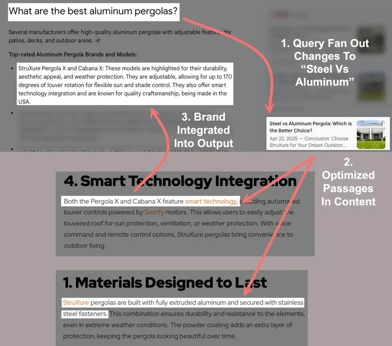 An example from Chris Long of how topical content for query fan out + passage-level optimisation works in Google's AI Mode:
