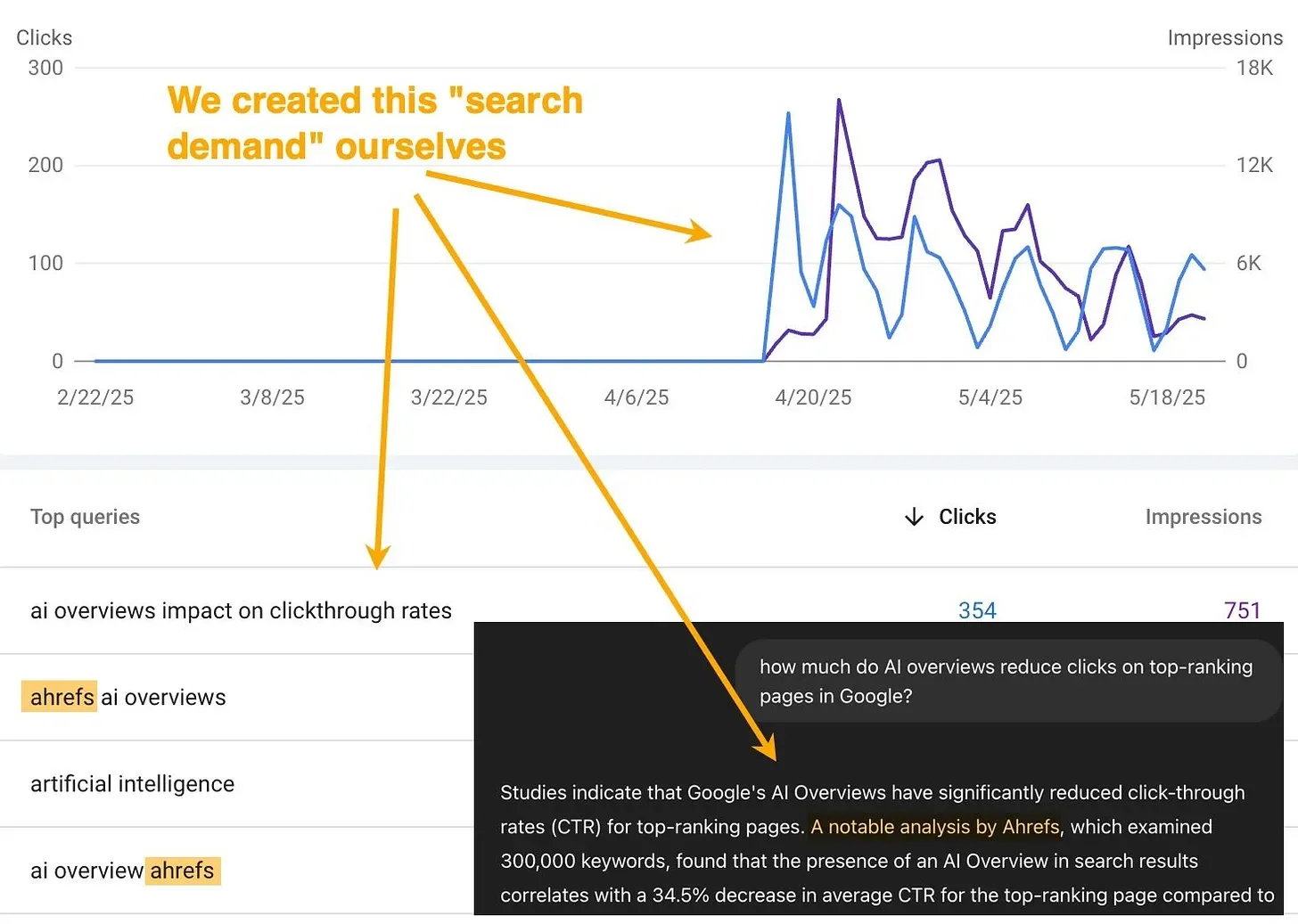 Search engines and AI agents want to know that people actively search for your brand and what you do. This doesn’t just need to lead to homepage visits. You should create this demand yourself. Just look at what Ahrefs did with their research and superb content around AI Overviews recently.