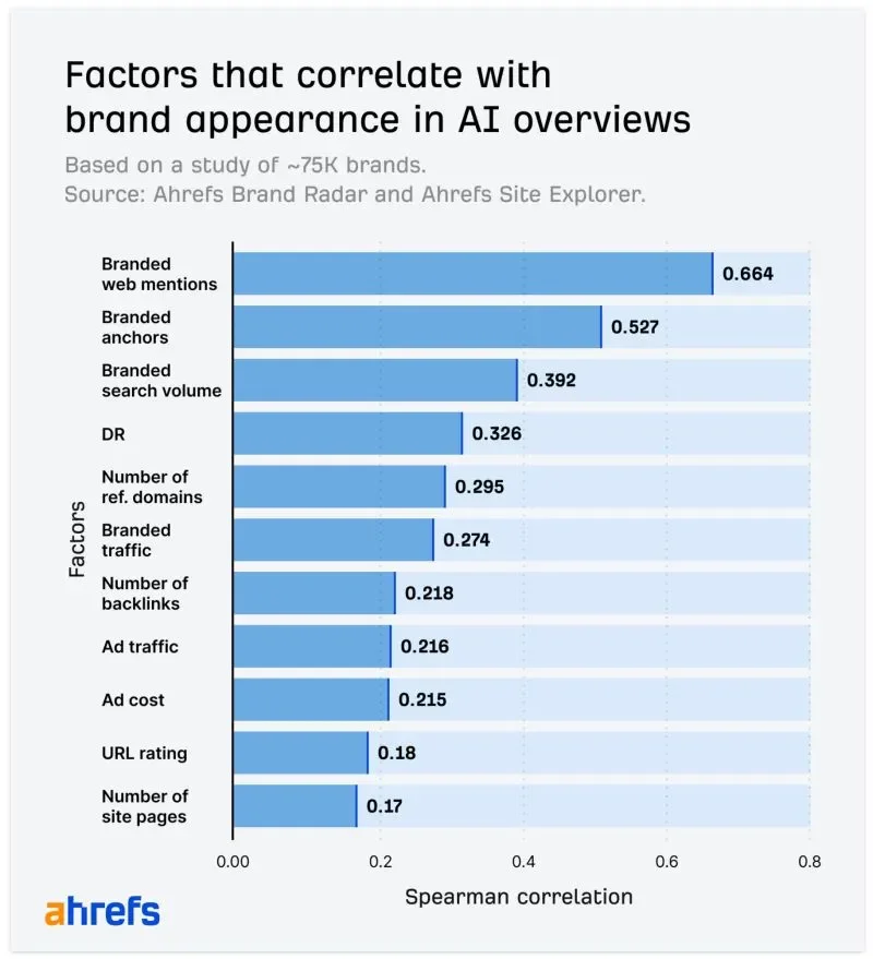 If we compare this with Ahrefs excellent analysis on factors that correlate with AIO visibility, you see the similarities. Branded web mentions, anchors, search volume, authority and links.