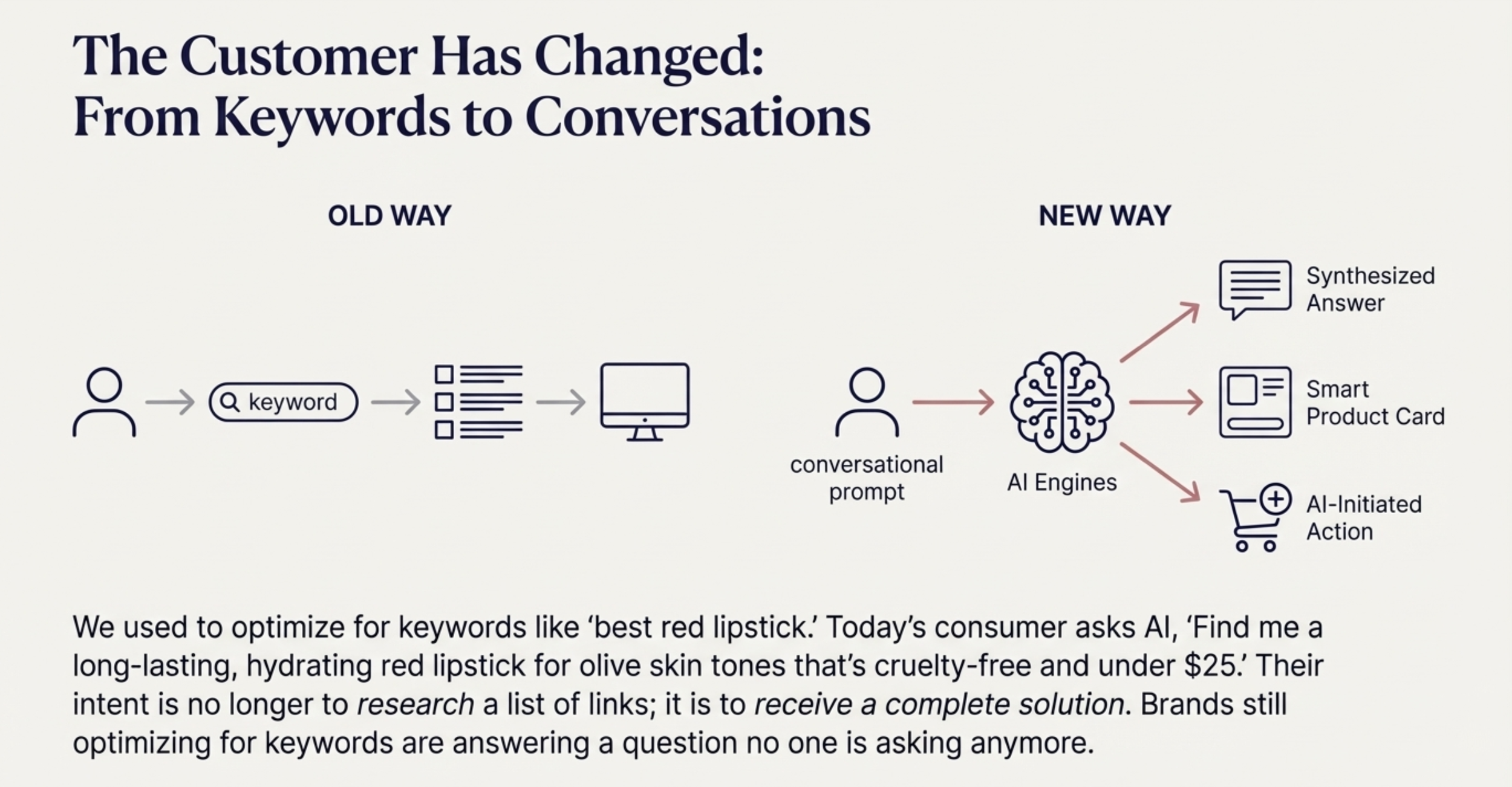 • The Shift: AI agents function as "Answer Engines." When a user asks, "What is the best serum for acne scars?", they do not want a list of links; they want a solution.