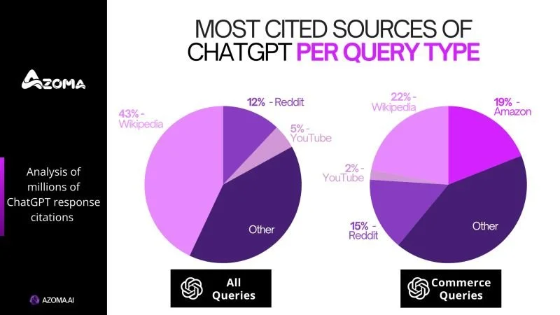 Data evidence: In commerce queries, Amazon jumps to 19% of citations, second only to Wikipedia. ChatGPT relies on Amazon’s structured data — product titles, reviews, and rankings — to shape buy-now recommendations.
