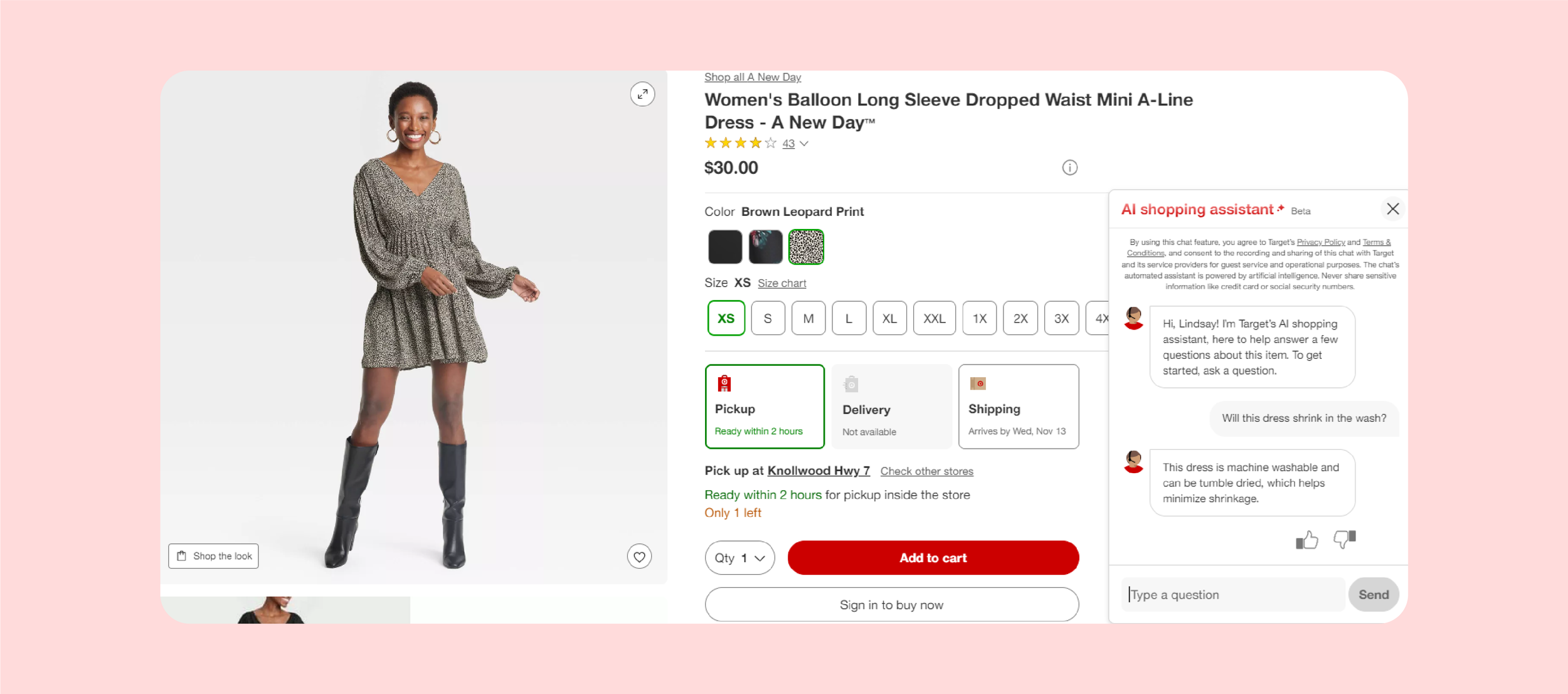 📌 Figure 2: Target’s Shopping Assistant (beta) on a product page – user asks, “Will this dress shrink in the wash?” Assistant pulls care info from product details and answers in context.