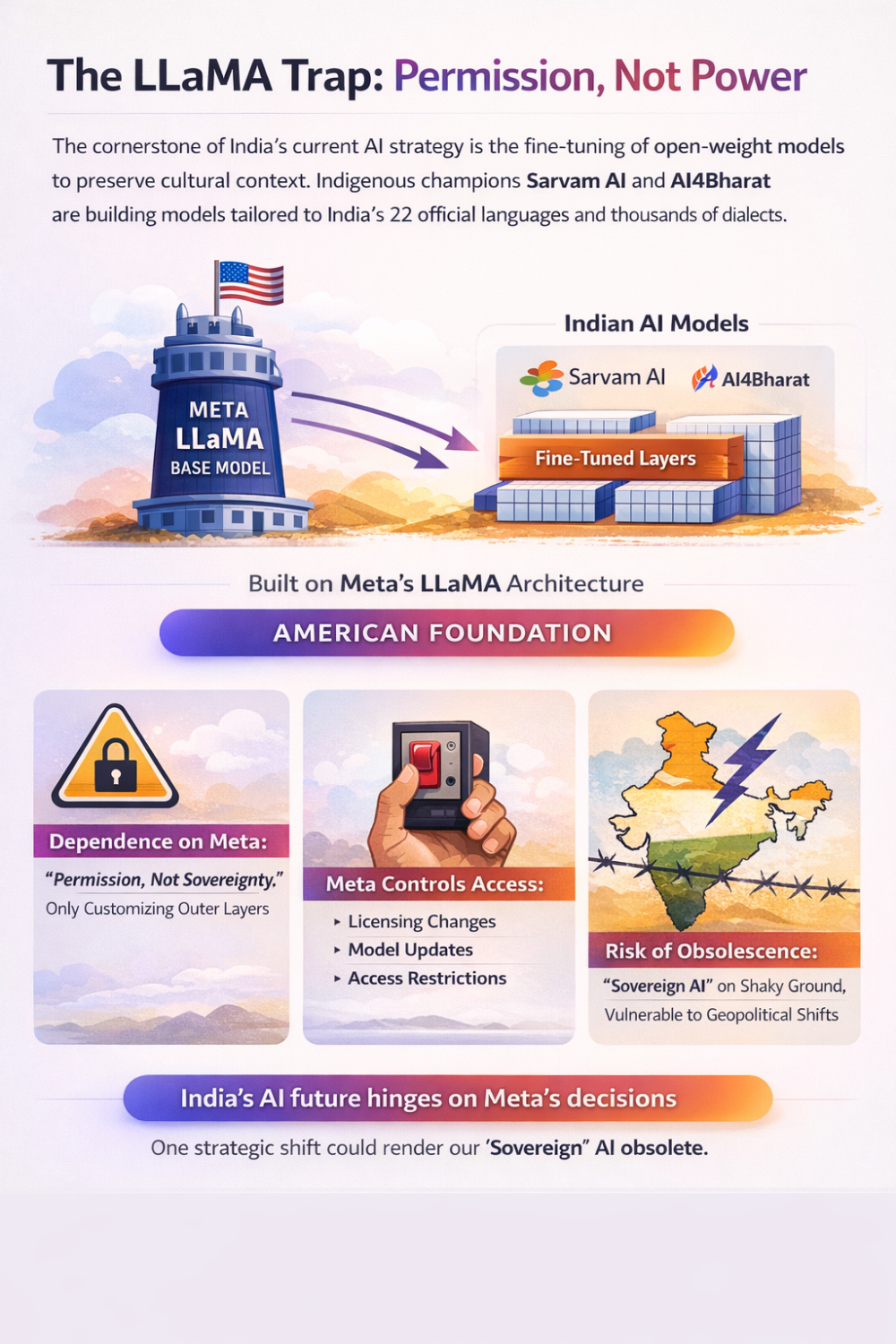 This creates an existential strategic dependency. Meta retains the power to update LLaMA, revise licensing terms, or restrict access at any time. India’s investment in culturally relevant AI sits entirely on a foundation controlled by a single American corporation. If the geopolitical winds shift, or if Meta alters its open-source strategy, India’s "sovereign" capabilities could be rendered obsolete overnight.