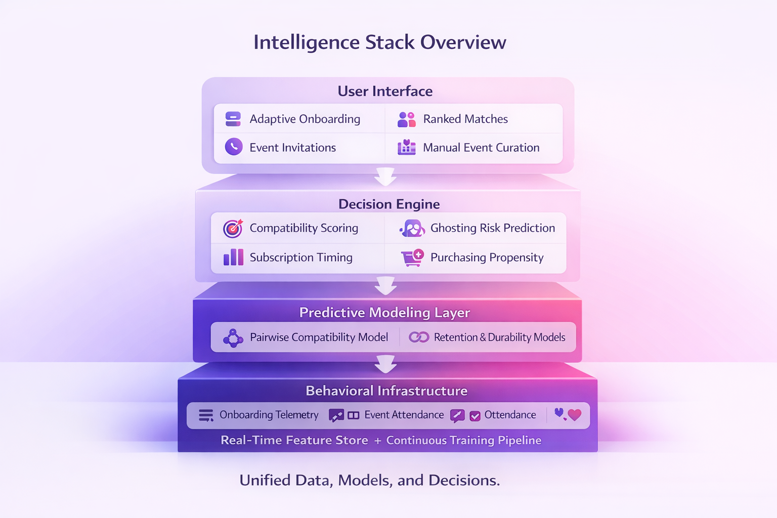 At the top layer is the user interface — adaptive onboarding, ranked matches, event invitations. These are visible manifestations of a deeper system.