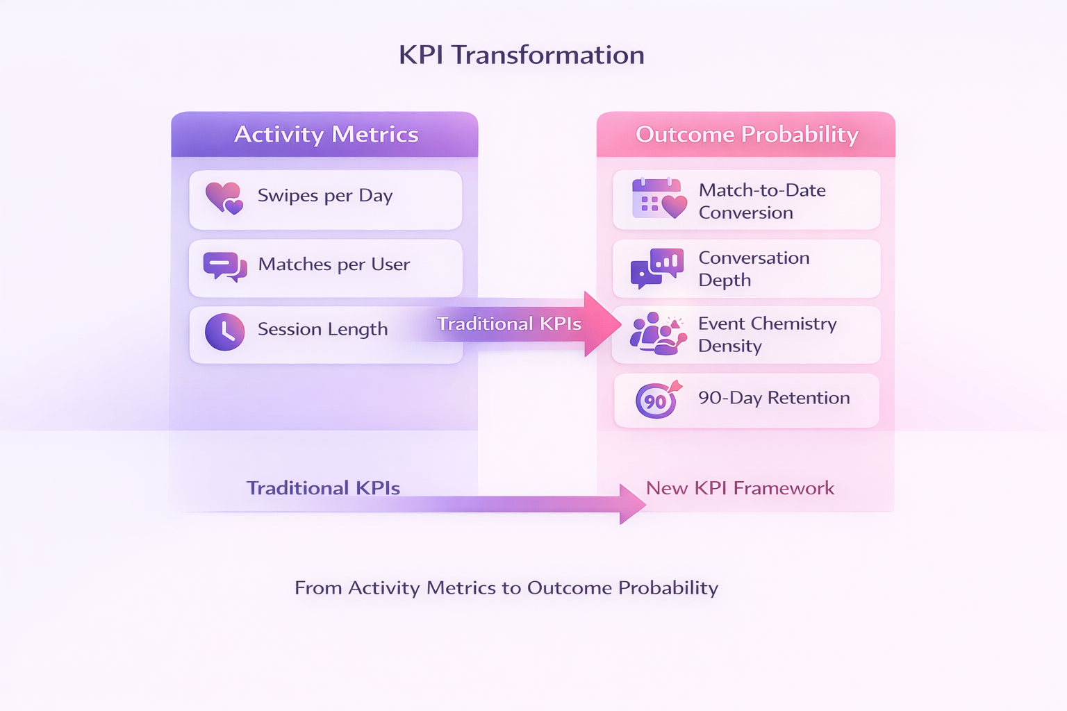 Our KPI framework measures outcome probability: match-to-date conversion, conversation depth, event chemistry density, 90-day retention.