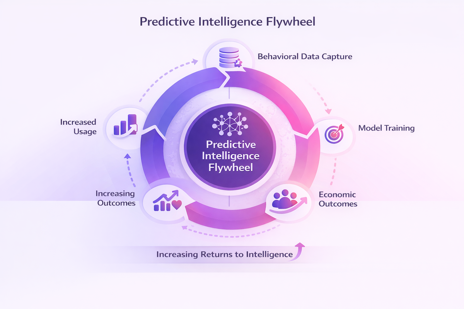 The flywheel produces increasing returns to intelligence. Over time, this creates structural defensibility because prediction quality compounds.