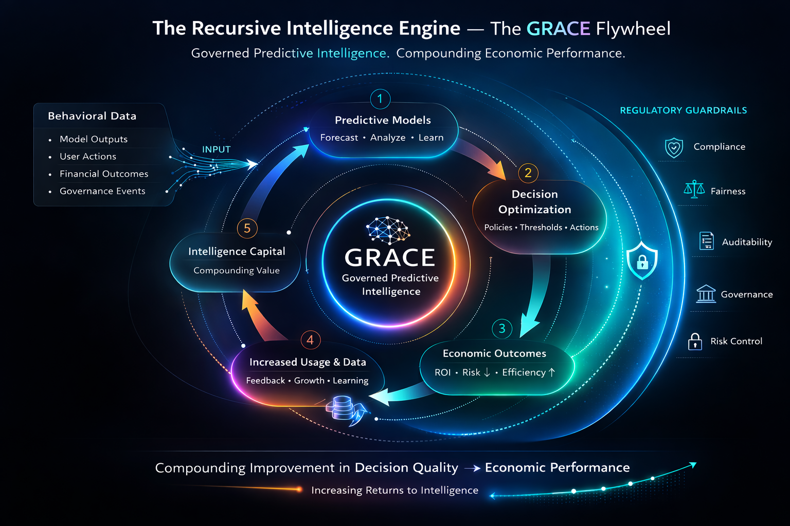 This diagram represents the core engine of GRACE—the Governed Predictive Intelligence Flywheel.