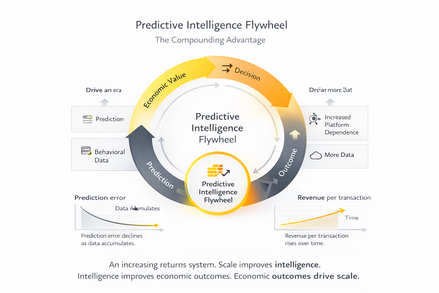 Over time, this intelligence capital compounds. Prediction error declines. Revenue per transaction increases.