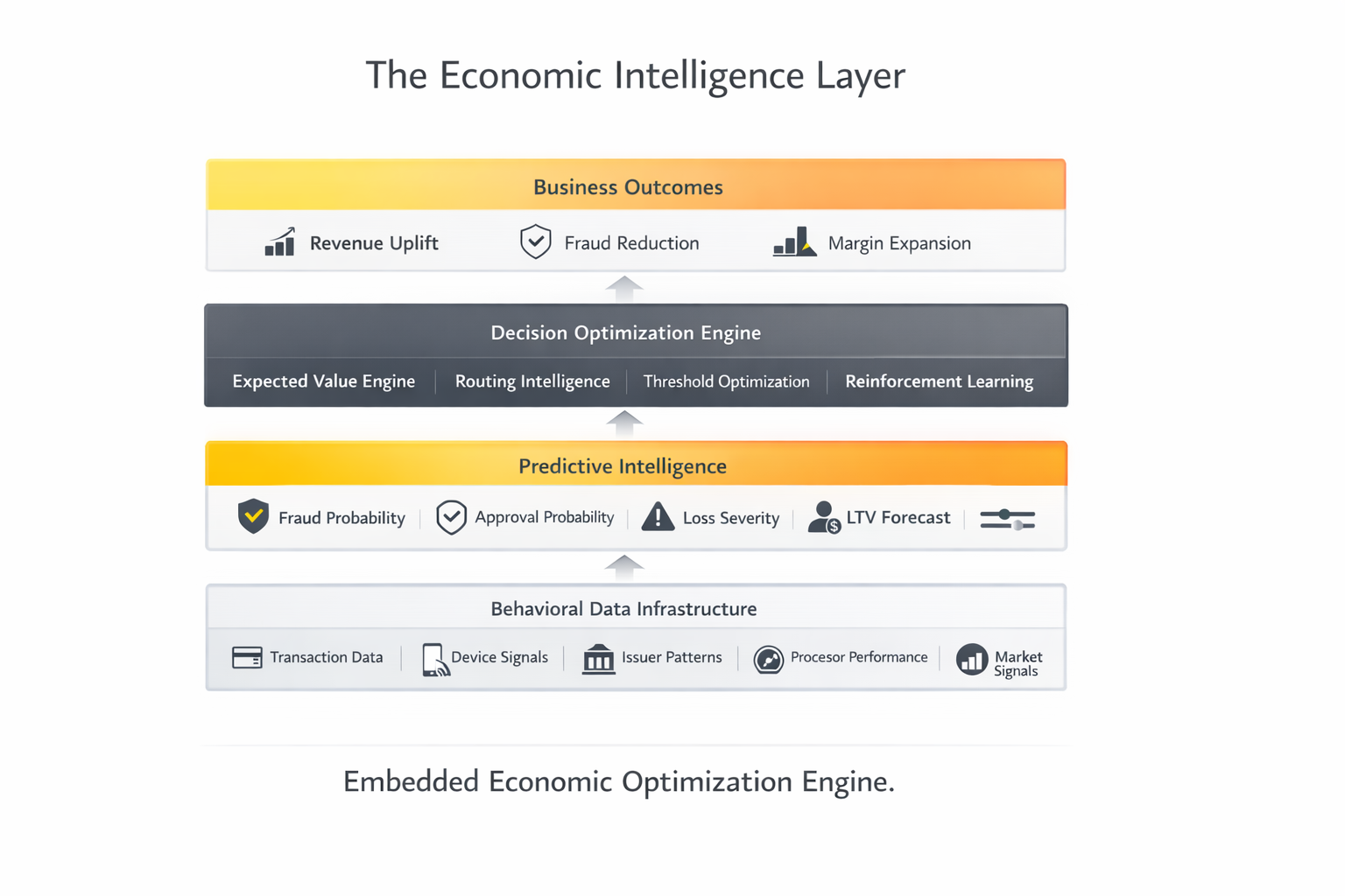 At the foundation is behavioral data — every transaction, issuer response, device signal, and processor outcome.
