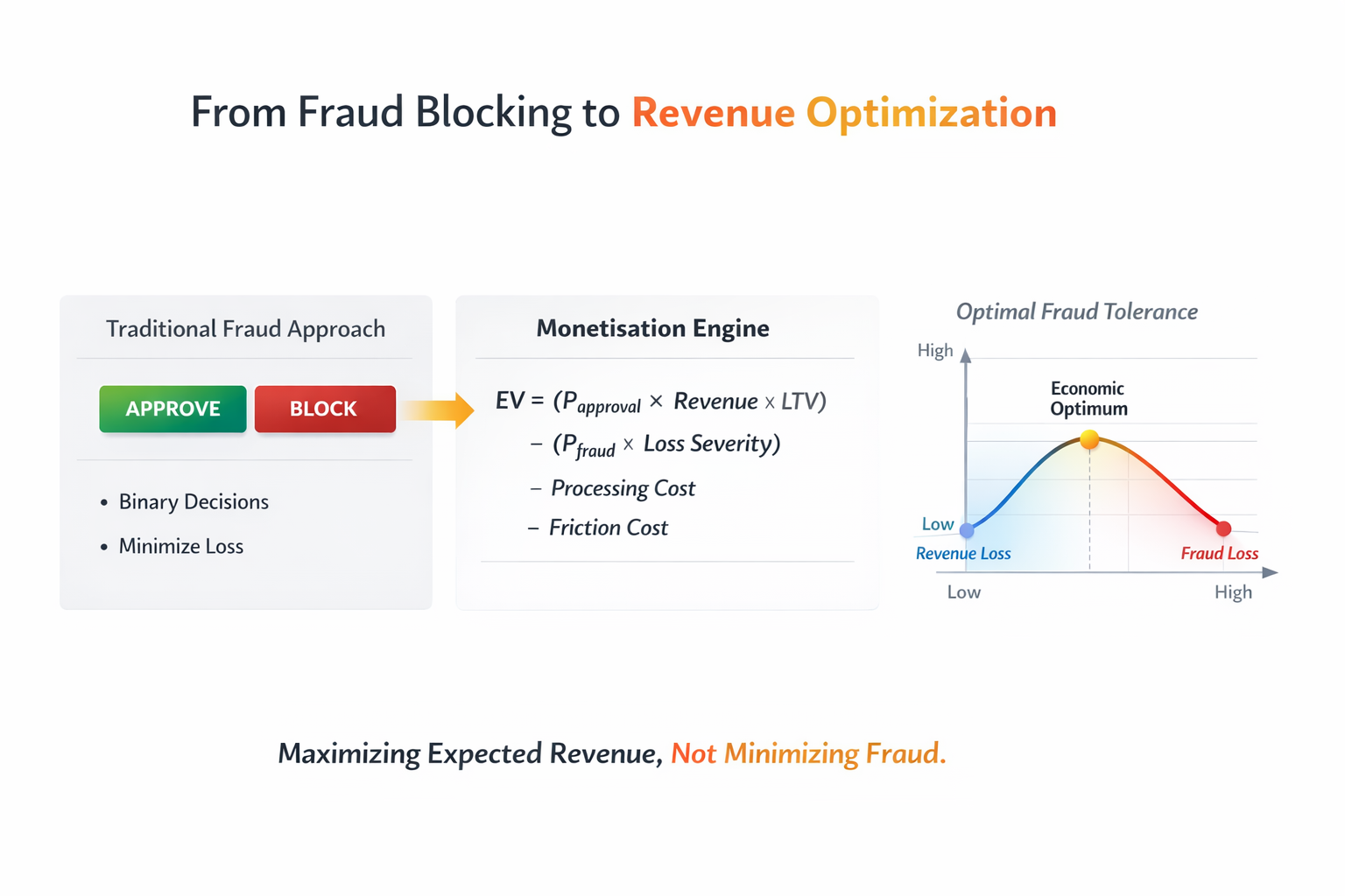 This reframing — from fraud minimization to revenue maximization — is the core conceptual shift.