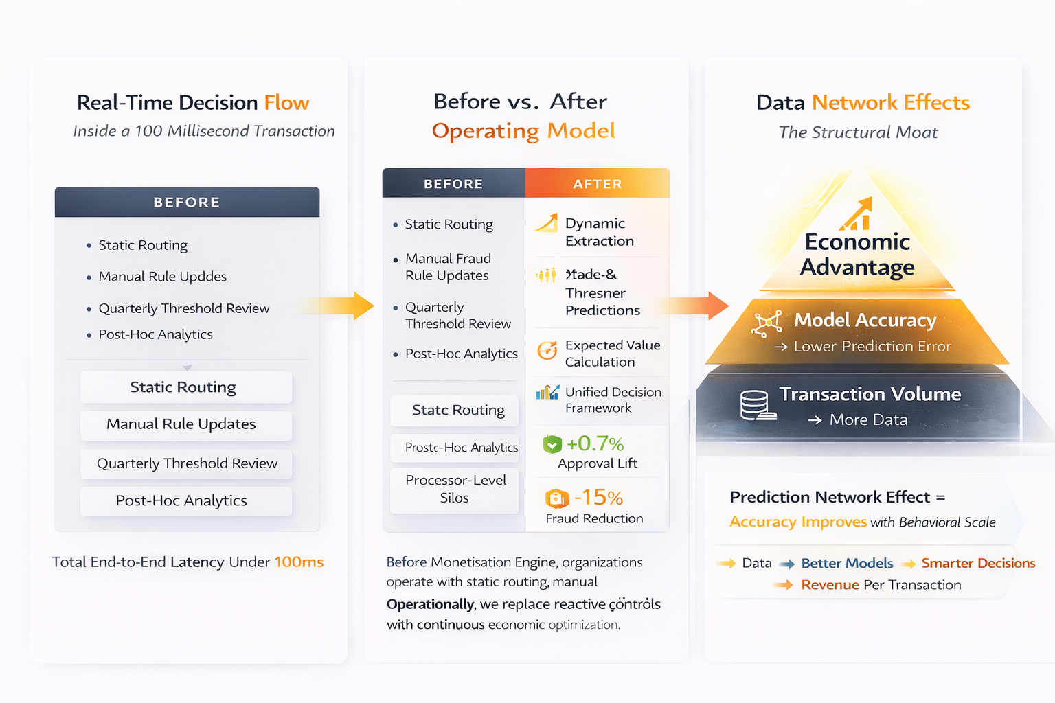 Before Monetisation Engine, organizations operate with static routing, manual rule updates, and quarterly fraud threshold reviews.