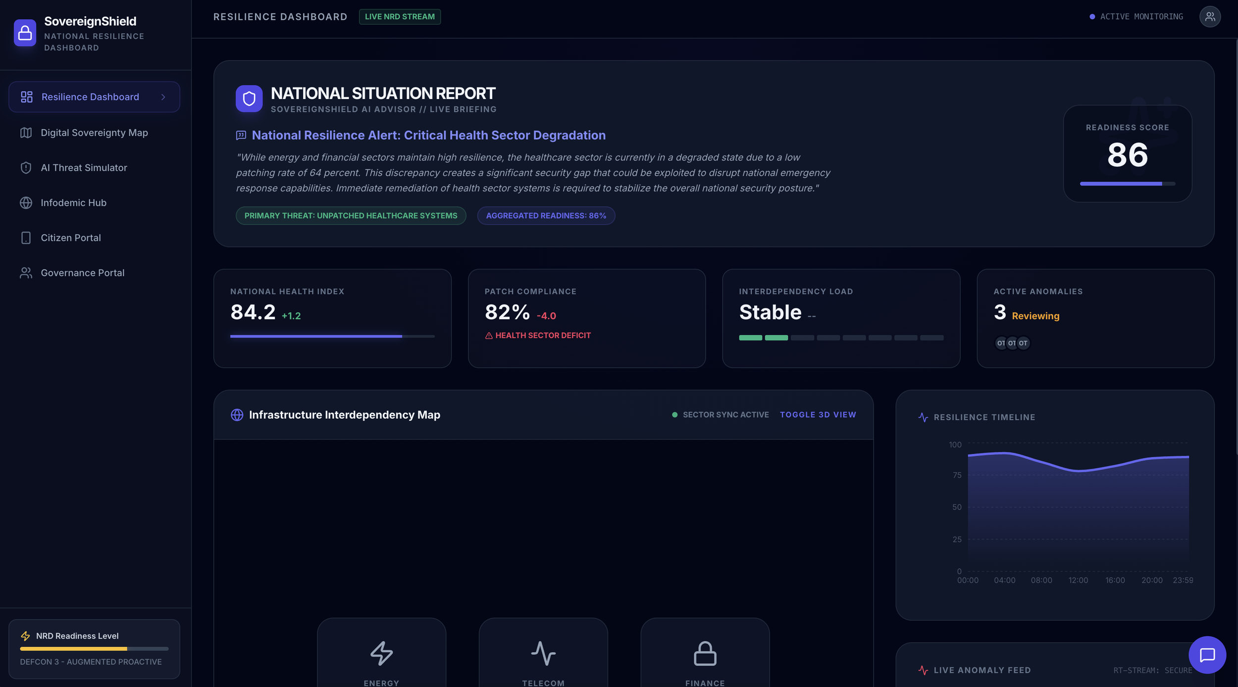 SovereignShield is a comprehensive, AI-driven national resilience platform designed to safeguard critical infrastructure and enforce digital sovereignty. By integrating real-time sector health monitoring, adversarial threat simulations, and automated counter-infodemic strategies, the application empowers both government agencies and citizens with a "Whole-of-Society" security posture. Its high-fidelity dashboard transforms complex transnational dependency data and geopolitical risks into actionable insights, ensuring national stability in an era of hybrid threats and information disorder.