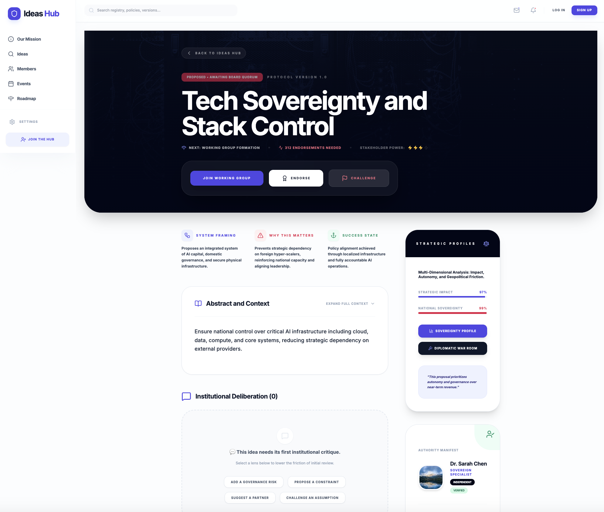 Tech Sovereignty Ideas Hub is a collective-intelligence platform dedicated to securing the future of digital autonomy by coordinating the infrastructure, governance, and capital required for technological independence. It reduces reliance on external hyperscalers through sovereign compute, data residency, and regional cloud alliances; advances anticipatory governance centered on human accountability, explainable AI, and national security; and shapes the global narrative of technology as an integrated system of assets—capital, talent, and strategic foresight. Through its Kinetic Lifecycle, the Hub guides ideas from raw proposal and community-driven refinement to geopolitical stress testing and direct policy implementation, transforming early concepts into resilient, sovereign-grade technology and policy outcomes.